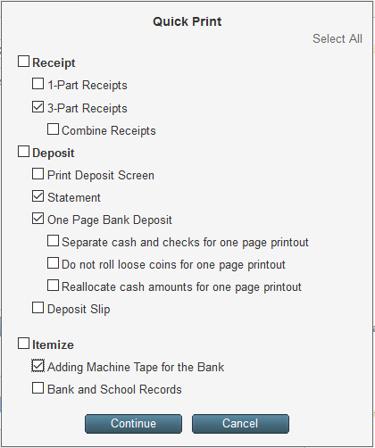 The Quick Print Menu, 3-Part Receipts will allow the user to print all of the deposit receipts. A separate receipt will be printed for each category.