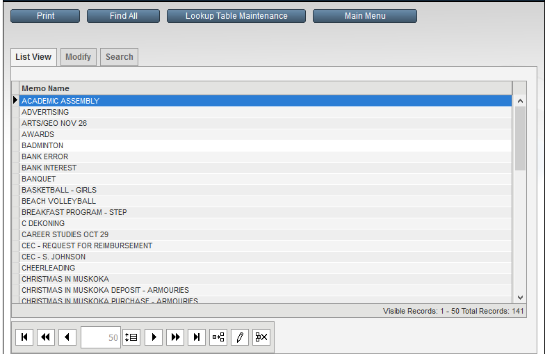 Main Menu > Program Maintenance > Table Maintenance > Lookup Table Maintenance > Memo