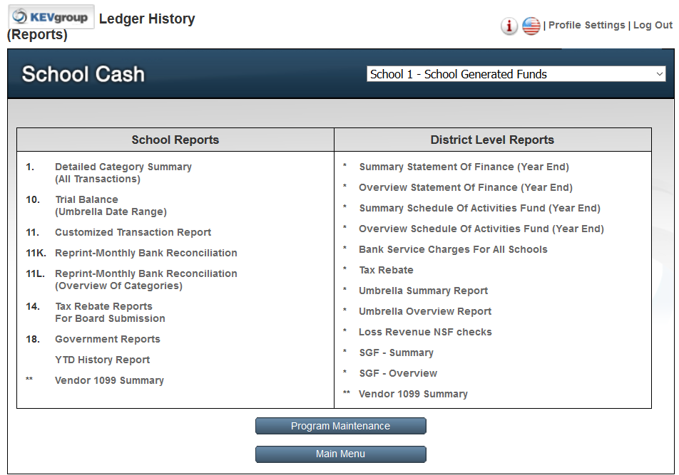 Main Menu > Program Maintenance > Ledger History (Reports)