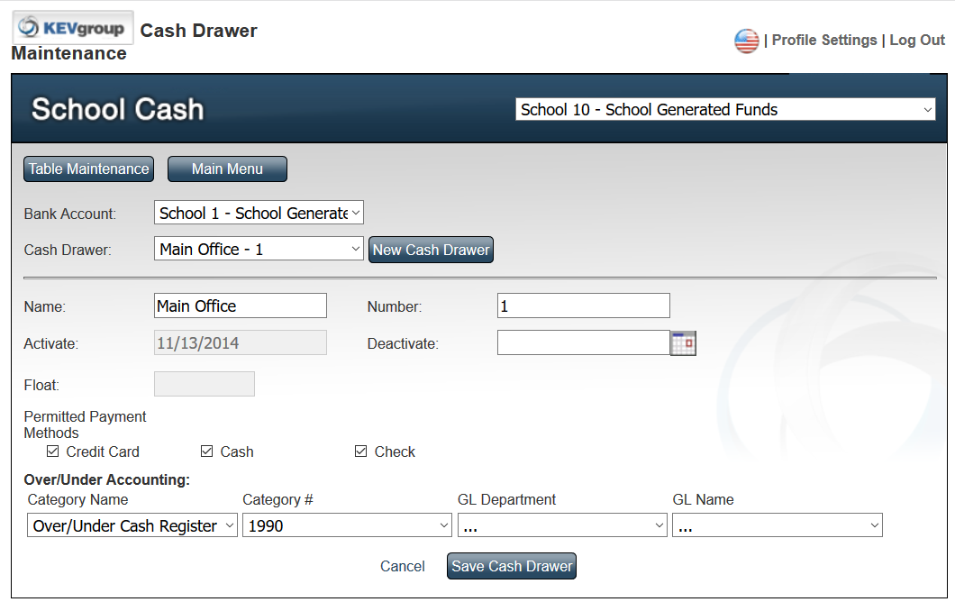 Main Menu > Program Maintenance > Table Maintenance > School Cash Register Maintenance