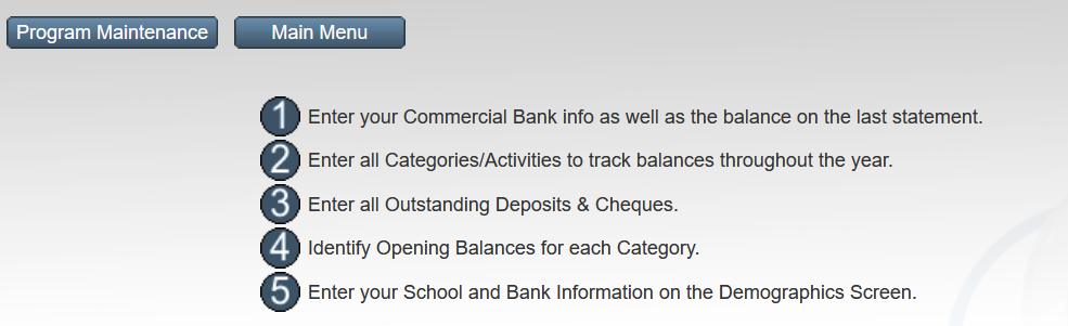 Information about existing bank accounts is provided by the district's setup. It is important to verify the accuracy of any bank account information.