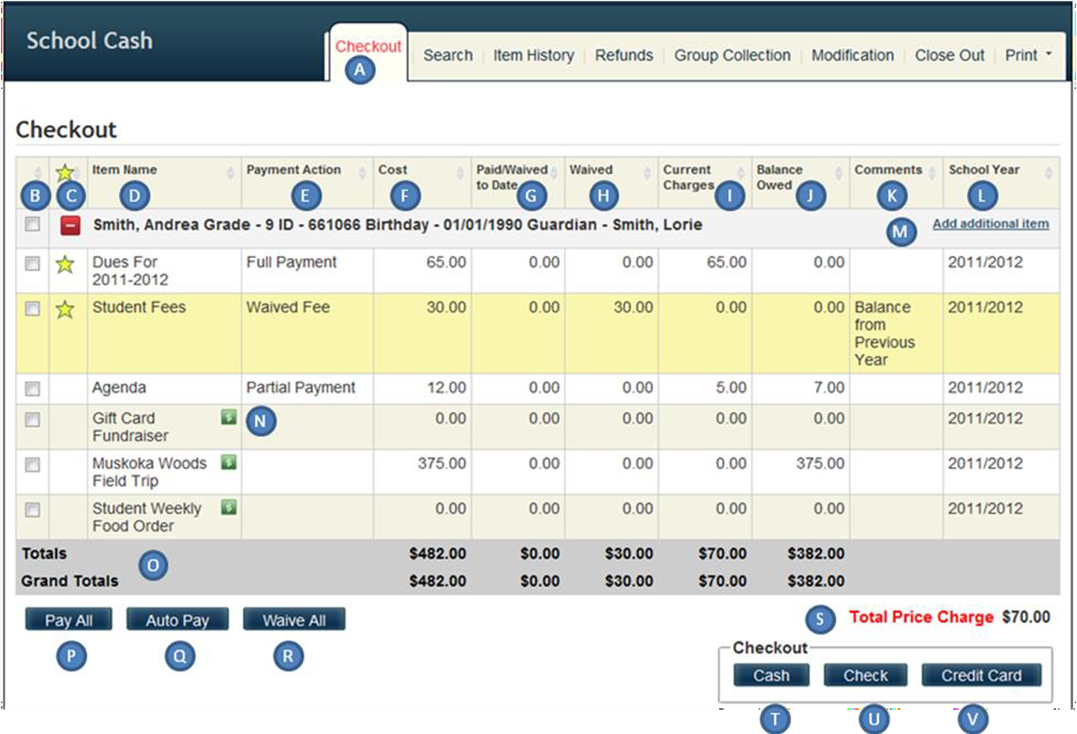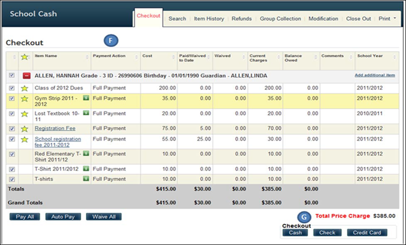 - G: Paid/Waived To Date – shows a balance if an item has been partially waived