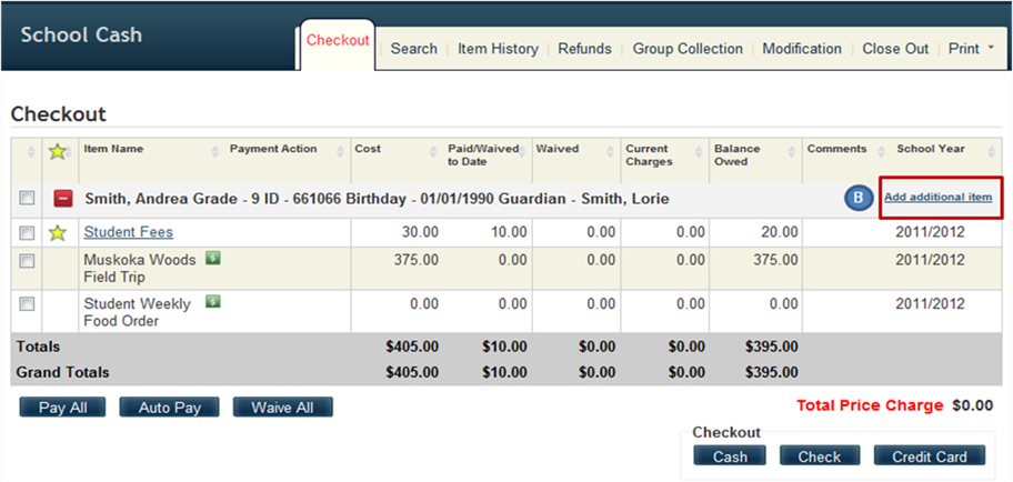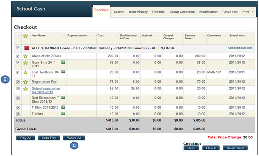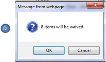 - R: Waive All – selecting checkbox (B) and Waive All (R) automatically assigns items checked as Waived Fee