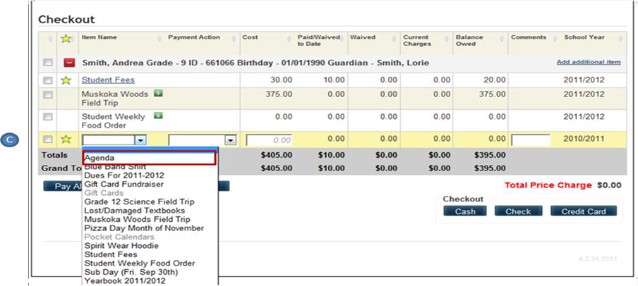 Example: A full payment was entered for an agenda, but the student wishes to pay for a different item instead.