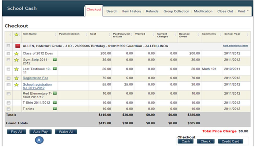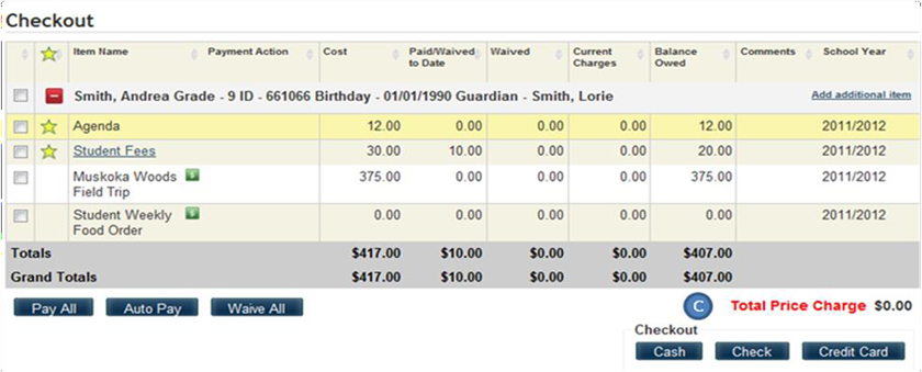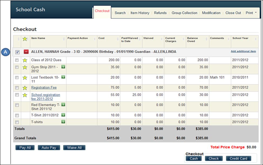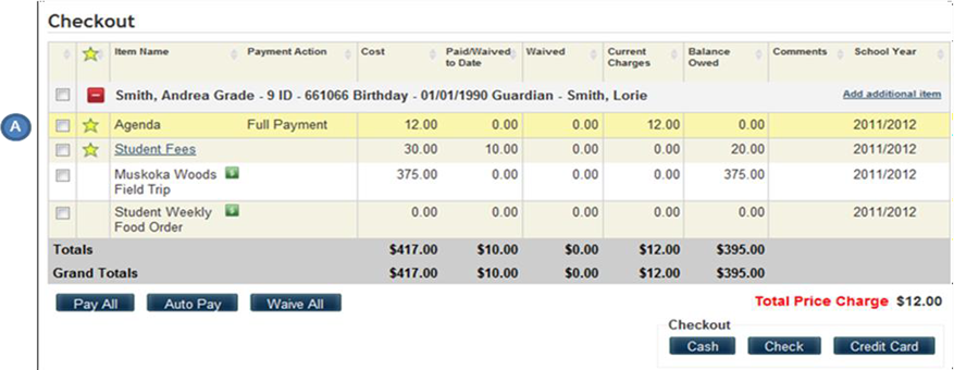 Use the Pay All option to quickly mark a group of items fully paid. For example, if the individual wants to pay only for the required items: