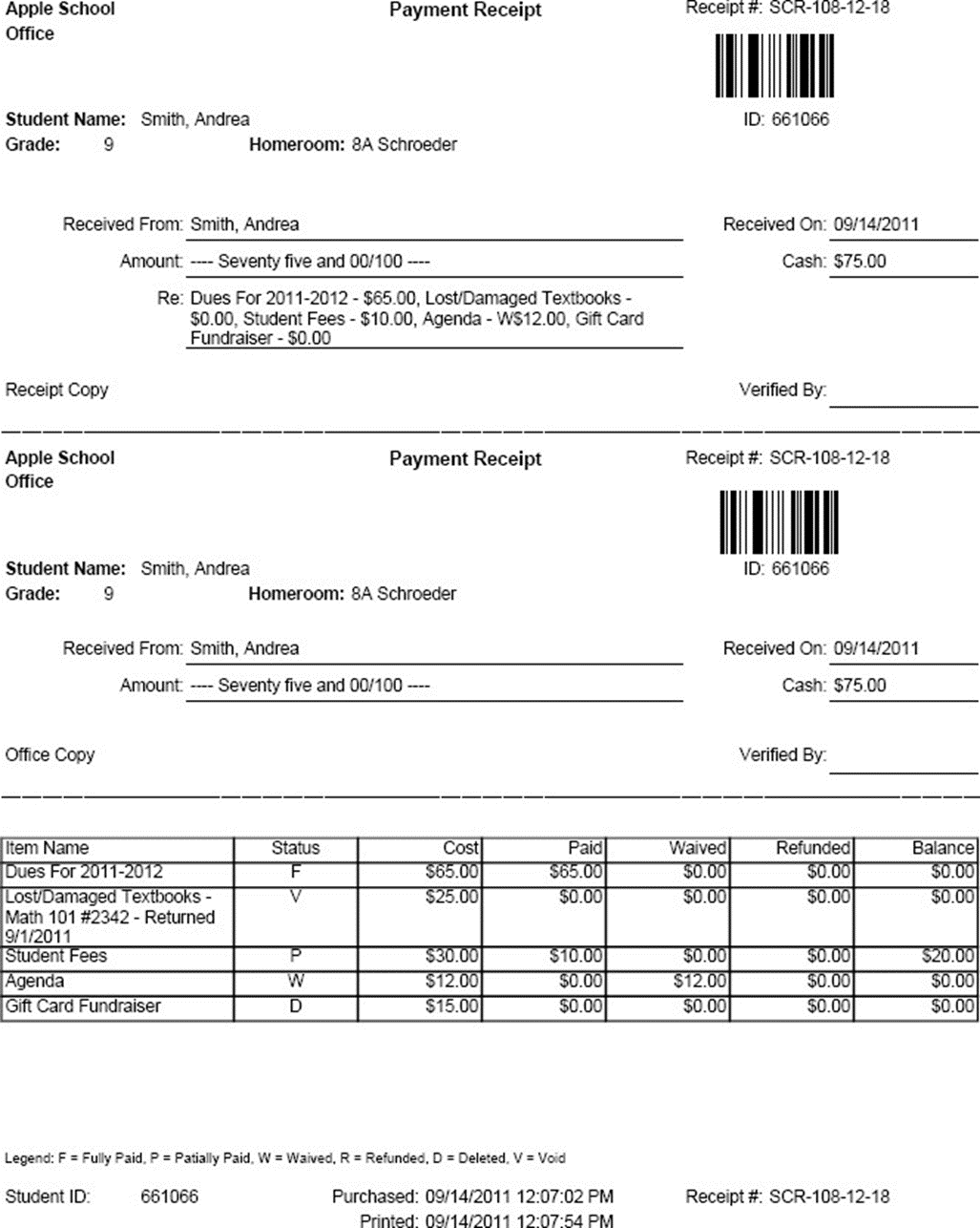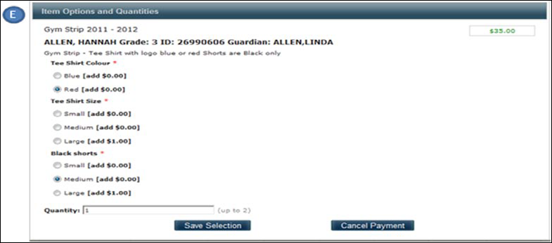 - F: Cost - Amount entered in School Cash Catalog. Does not include the cost of options (N)