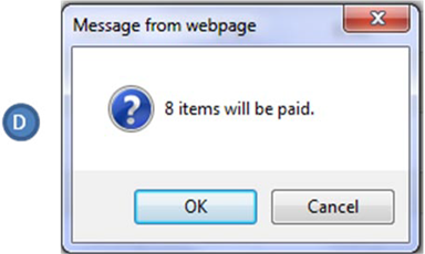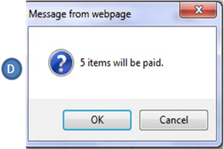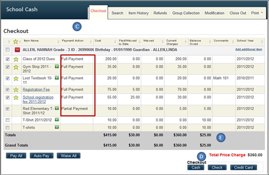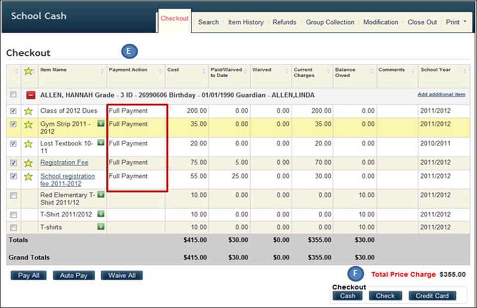 - P: Pay All – selecting checkbox (B) and Pay All (P) automatically assigns items checked as Full Payment