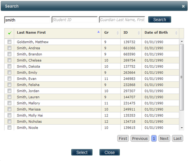 - Search for the student’s name, student ID, or Guardian Name, then select the checkbox for the student.