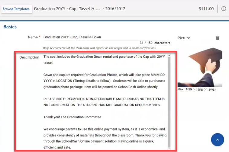 - In School Cash Online, create a new item using the Graduation Cap, Tassel, and Gown template.