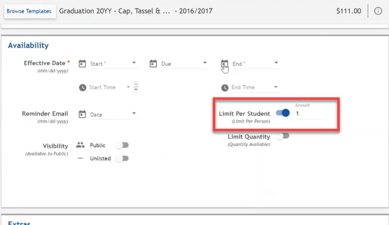 - Set the purchase limit for the cap and tassel to 1 per student.