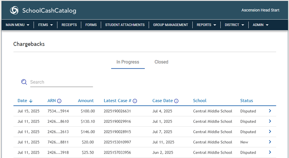 - School: What school the chargeback/dispute has been applied to. Multiple schools can be listed on this page.