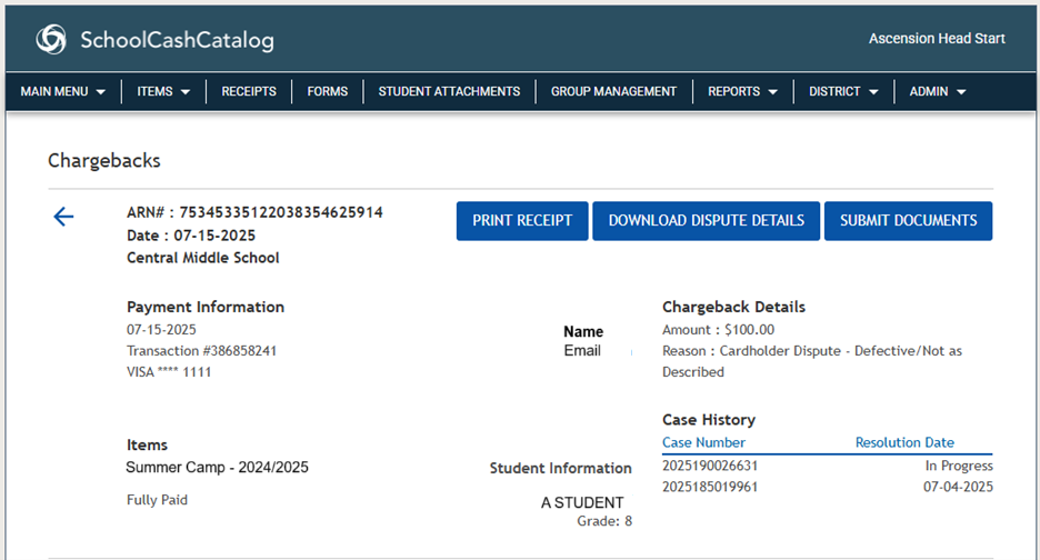- When a chargeback/dispute is selected, a new page will display with all the details regarding that dispute, including ARN #, Date, School, Payment Information, Items and Chargeback Details.