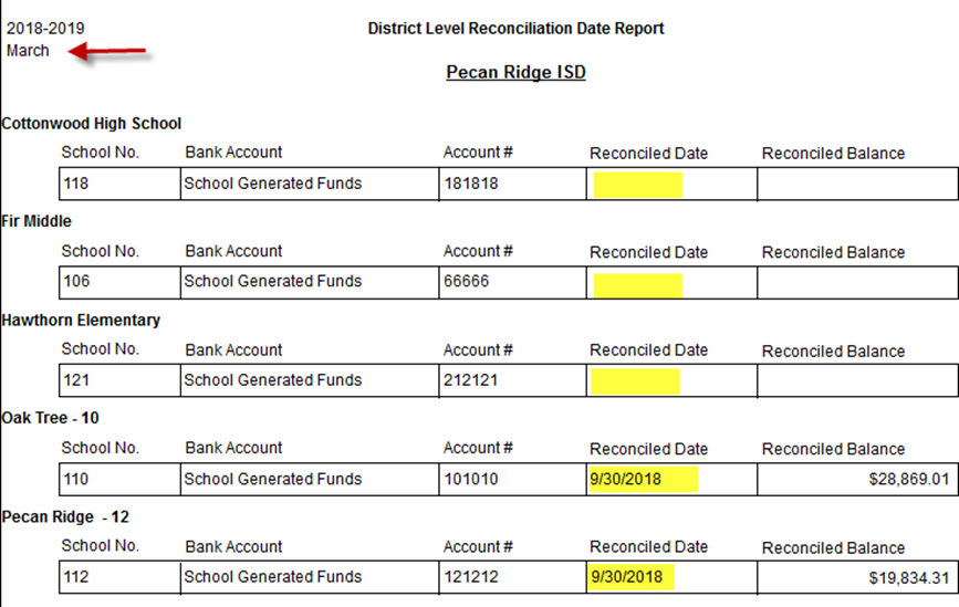 Go to: Main Menu > Reports Menu > District Level Reports > Reconciliation Date by School