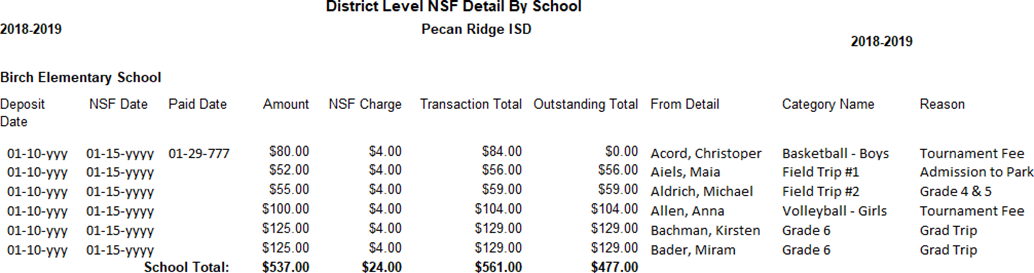 This report shows schools that have incurred losses due to Non-Sufficient Funds (NSF) checks. Details include the check amount and the date of the loss.