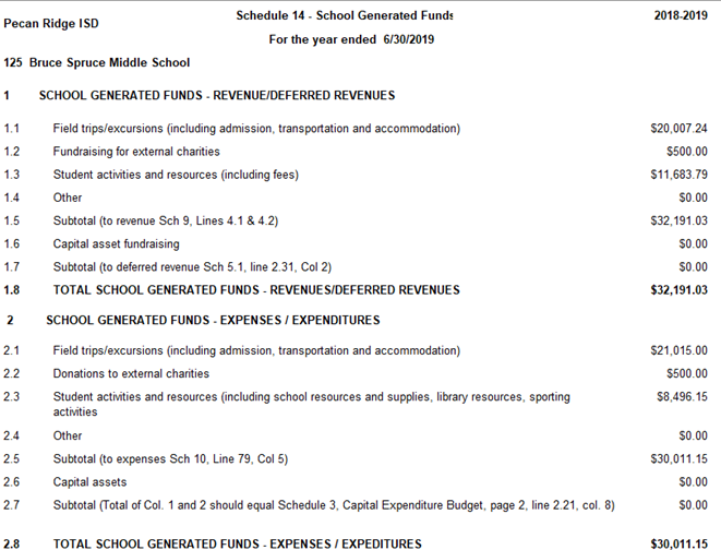 This report shows an overview of school funds. Note: See Category documentation for further details on Schedule E reporting.