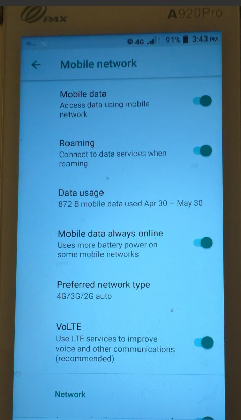 - Ensure the toggles are on for Mobile Data, Roaming, Mobile Data Always Online, VoLTE, and automatically select Network. Preferred Network type should be set to 4G/3G/2G auto.