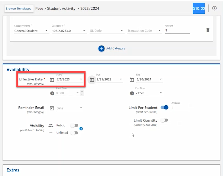 - Set the start date to July 5th so the fee is available before the school year begins.